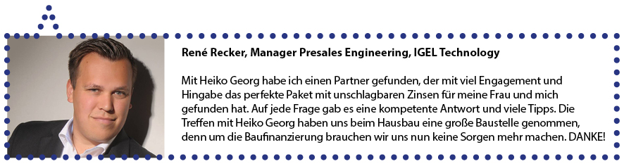 Mein besonderes Fachwissen habe ich bei der Vermittlung von Baufinanzierungen, Einbringung von KFW-Darlehen sowie Umfinanzierungen zu TOP-Konditionen.